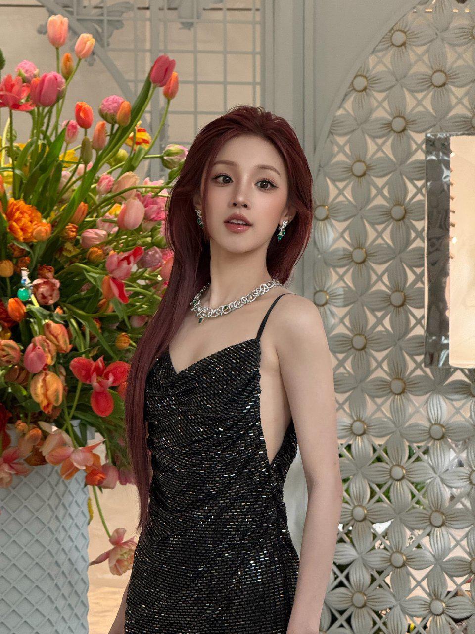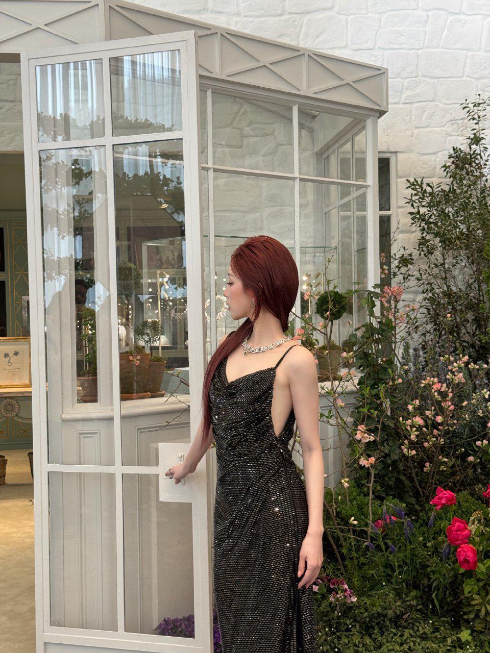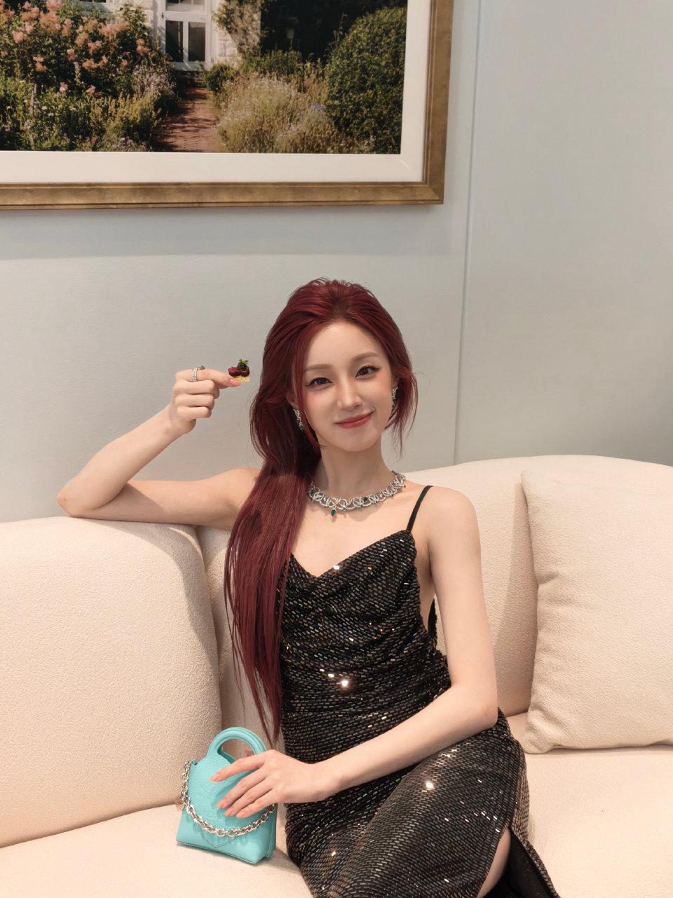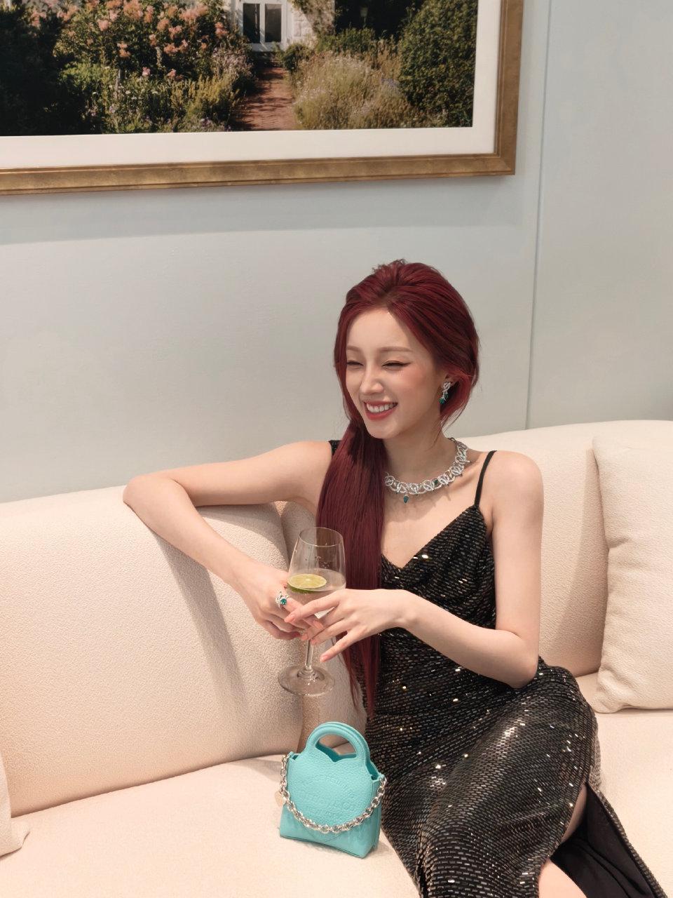 宋雨琦红发造型明艳又高贵,一袭黑色亮片吊带裙衬得气质斐然。